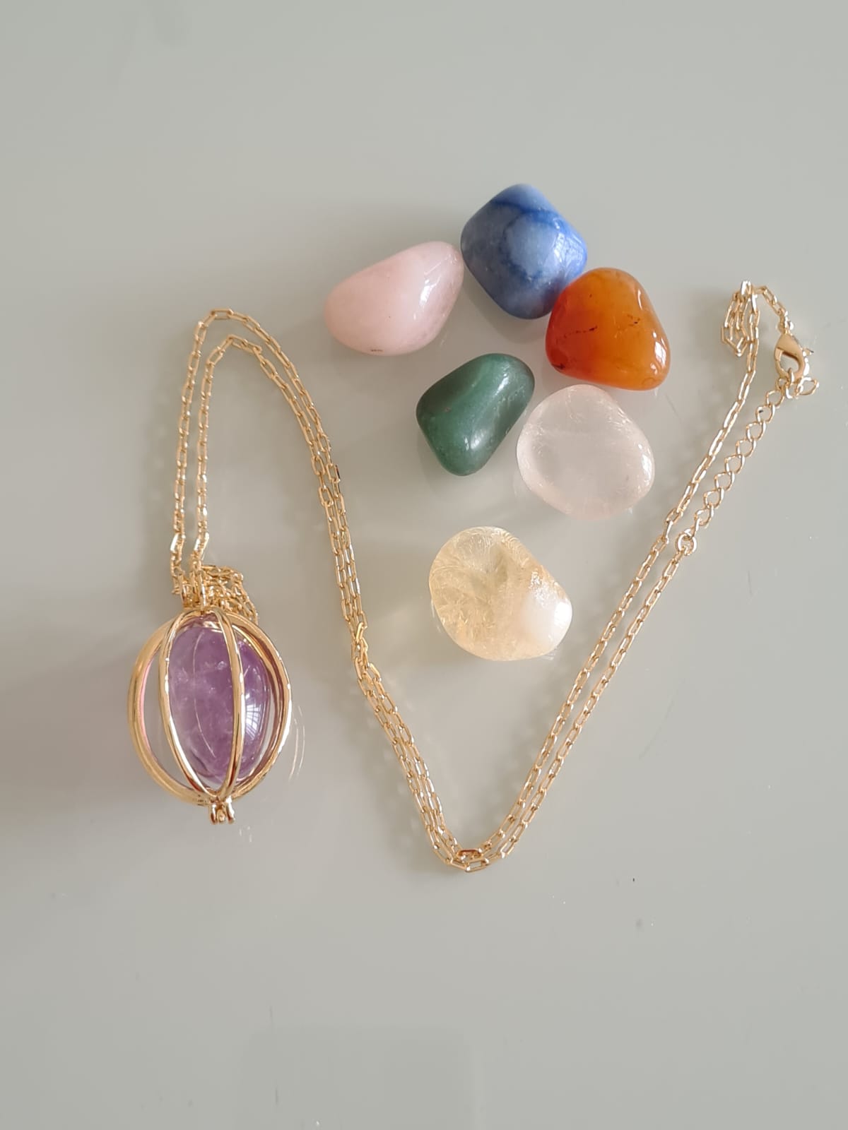 O Colar Sete chacktras é formado por uma unidade de cada minerais que compõem os chackras.
