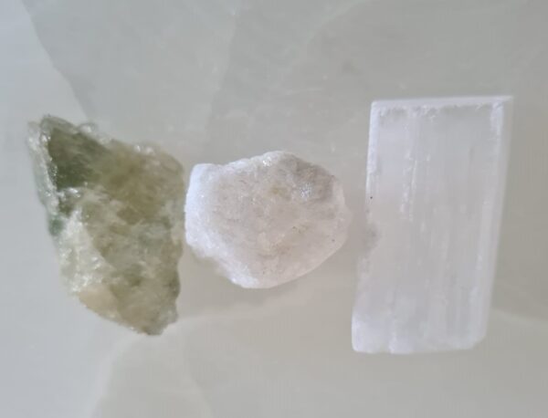 Kit terapêutico formado por: Selenita Branca (1 unidade). Água Marinha (1 unidade). Dolomita (1 unidade).